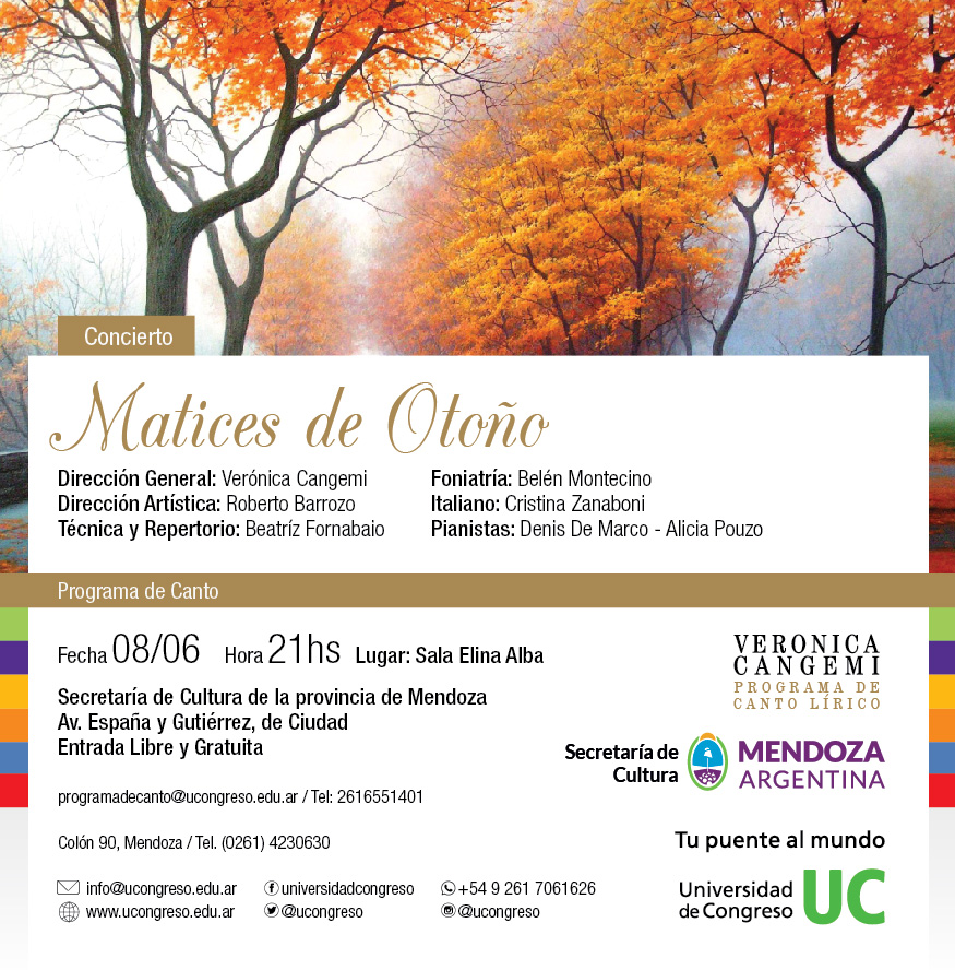 La secretaría de Cultura de la ciudad de Mendoza los invita a participar del concierto “Matices de Otoño” el día 8 de Junio a las 21 hs en la Sala Elina Alba, ubicada en Av. España esquina Gutierrez. La entrada es Libre y Gratuita. Dirección General: Verónica Cangemi Dirección Artística: Roberto Barrozo Técnica y Repertorio: […]