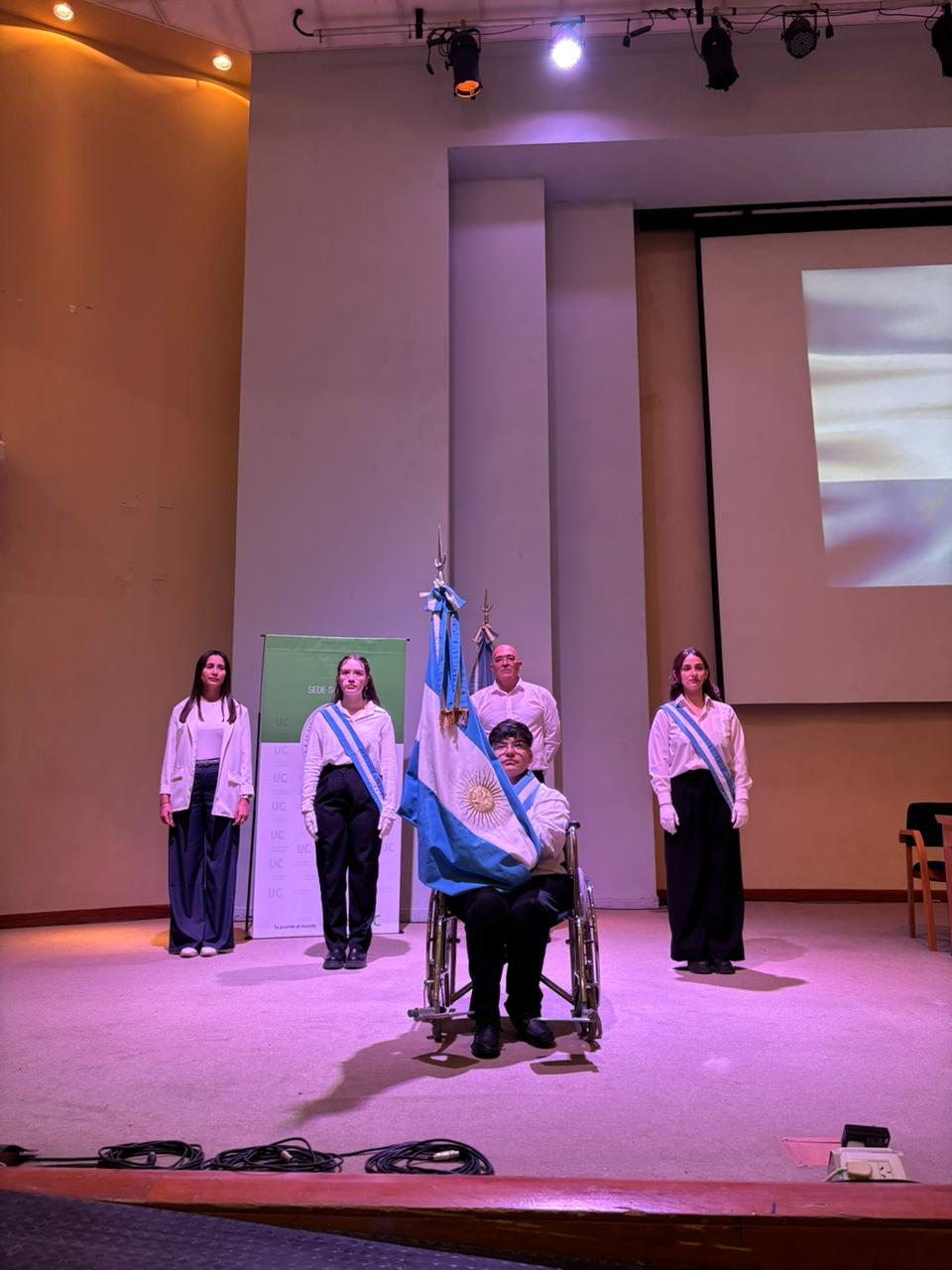 El honor de portar la Bandera Nacional fue otorgado a Alexis Nicolás Escobar, estudiante de la carrera de Psicopedagogía, con un promedio general de 9,50, Nicolás, de 25 años, es un ejemplo de superación personal, nació con macrocefalia y meningocele, y lejos de ser un obstáculo, esa condición se transformó en una fuente de fortaleza y motivación para avanzar cada día. Su historia es un testimonio de perseverancia y un recordatorio de que los límites pueden superarse con esfuerzo y esperanza.